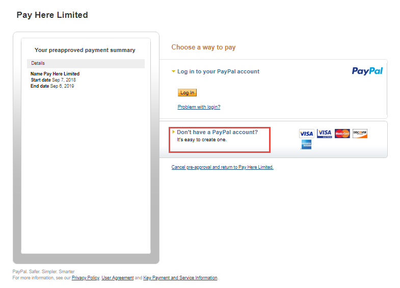 You are being asked (or you have chosen) to set up a pre-authorisation. In this case, you cannot make a one-off payment by card. You can only pre-authorise payment with a PayPal account and therefore the only options you will be given on PayPal’s screen will be to log into your PayPal account or to set up a new PayPal account: