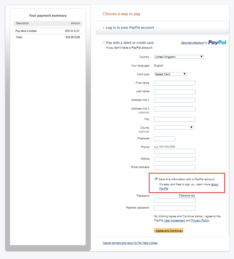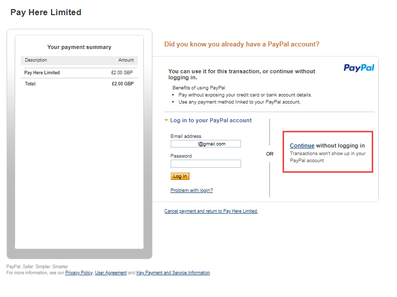 Lastly, there are some instances when the PayPal page directs you to login to a PayPal account because it recognises your email address or card details and frustratingly will not allow you to 'Continue without logging in'.
